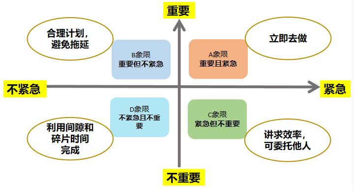 将时间在重要和紧急两个维度上进行划分,区别安排,将让我们每天的生活更有条理。在时间管理中,我们通常会遇到很多来自外界的干扰,这时候需要适时说“不”,保护好我们的时间,同时还有一些如下的小方法,可以帮助大家高效利用时间。