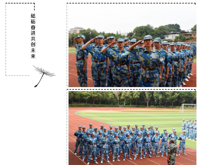 训练场上,你看,军姿笔挺!你听,战歌嘹亮!从稍息、立正、跨立、蹲下、敬礼、齐步走……,从太阳初升到夜幕降临,从烈日当空到大风大雨,同学们始终以饱满的精神、精益求精的态度认真完成每一次训练,在上百次的练习中,增强规矩意识,锤炼意志品质,用汗水书写着自己的迷彩青春。