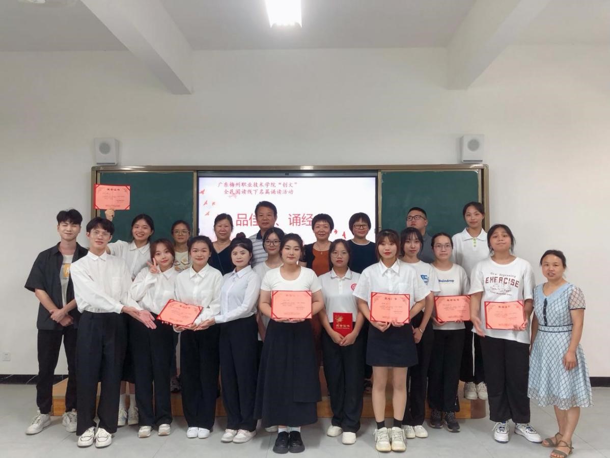 名篇佳作、经典诗文是华夏文明的载体,是民族的魂与根,广东梅州职业技术学院“创文”全民阅读线下活动——“品佳作、诵经典”名篇诵读活动很好地推动了全民阅读和校园文化的建设。该活动由公共课教学部牵头组织,由文科组老师担任评委老师,2023年6月12日下午在校本部北区举行,总共有9组中高职队伍参赛,上台诵读经典。