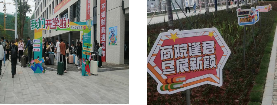 全院师生一齐出动,搭建咨询点、各自分组行动,以最饱满的热情迎接新生的到来。此时此刻的迎新点内,布满了精心准备的欢迎墙、妙趣横生的打卡海报与指示牌,迎新氛围感拉满。